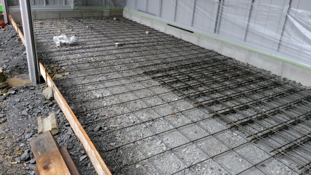 地盤を整正し砕石を敷き、入口の型枠の施工、ワイヤーメッシュ鉄筋の敷設、物置内パネルの養生までをした写真がこちらです。
